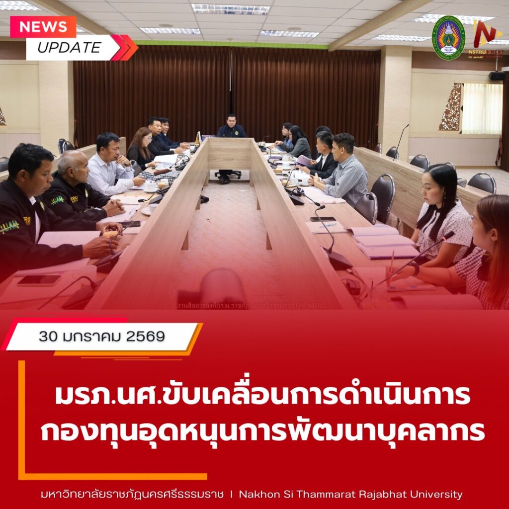 ประชุมกองทุนอุดหนุนพัฒนาบุคลากร ครั้งที่ 1/2569By พรชนก หมวดเมือง / January 30, 2026 ประชุมคณะกรรมการกองทุนอุดหนุนพัฒนาบุคลากร ครั้งที่ 1/2569 เมื่อวันที่ 30 มกราคม 2569 เวลา 13.30 น. มหาวิทยาลัยราชภัฏนครศรีธรรมราช กำหนดประชุมคณะกรรมการกองทุนอุดหนุนพัฒนาบุคลากร ครั้งที่ 1/2569 ณ ห้องประชุมสุดหอม สำนักงานอธิการบดี รายละเอียดเพิ่มเติม คลิก
